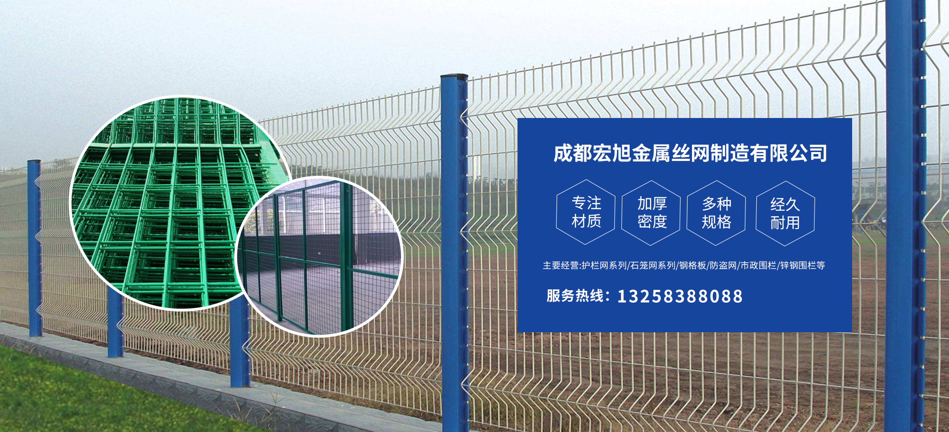 成都宏旭金屬絲網(wǎng)制造有限公司主營護欄網(wǎng)系列、石籠網(wǎng)系列、鋼格板、防盜網(wǎng)、市政圍欄、鋅鋼圍欄、鋼筋網(wǎng)片、聲屏障系列、波形護欄板、柔性纜索護欄、SNS邊坡防護網(wǎng)等其他絲網(wǎng)類產品。特殊規(guī)格可加工定做,也可根據(jù)客戶來圖來樣定做。自創(chuàng)業(yè)以來,公司一直堅持市場為導向,以客戶為根本,以實業(yè)為基礎,以技術為支持,以科研為后盾,集科研、生產、經(jīng)營為一體,不斷研制開發(fā)新產品,開拓市場,走綜合發(fā)展之路。多年來,公司憑借過硬的質量,良好的信譽、優(yōu)質的服務、合理的價格,贏得了市場和商家的一致好評。